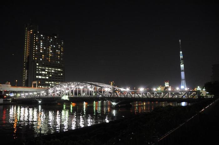 昭和3年9月、大林組の手により着工、昭和6年6月に完成しています。隅田川には、幾つもの大型の近代橋梁が架けられていますが、中でもこの鋼橋のその伸びやかに躍動するプロポーションは傑作の一つに数えられています。 |