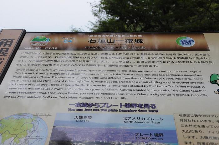 この城は、関東で最初に造られた総石垣の城で、石積みは近江の穴太衆による『野面積み』と言われ、石材は箱根湯本から入生田を通り、笠懸山に通じる山道が後に言う「関白道」で、その山中には、後に、江戸城の石垣用になる「安山岩」のごろた石が、ゴロゴロ転がっていたそうです。 |
