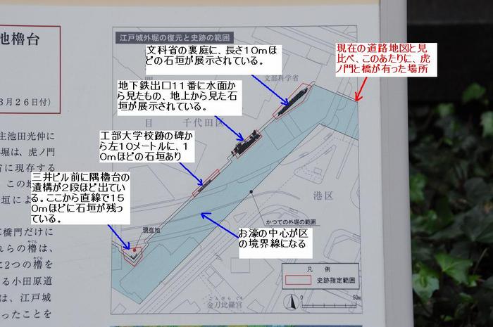 ところが、虎ノ門枡形の櫓門は、明和9年(1772)の行人坂の大火で焼失したため、その後は、再建される事も無く、明治6年に撤去され、溜池の消滅と同じくして、土地開発の波に飲み込まれ、石垣なども取除かれたり、そのまま、地中に埋められたりした。