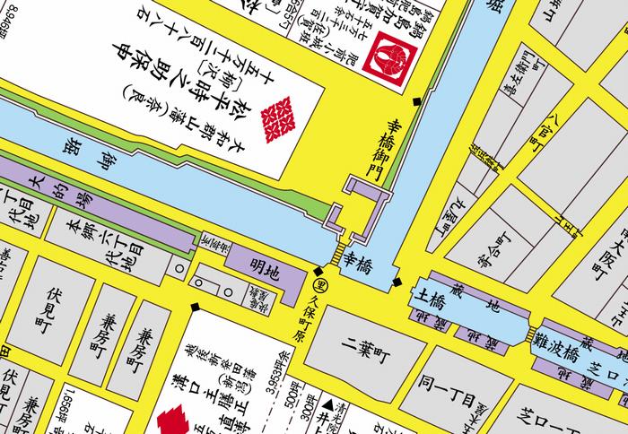 古地図の川は、左が虎ノ門方向、右が浜離宮方向、上の方に流れているのは、数寄屋橋、日比谷公園に向かっている。 |