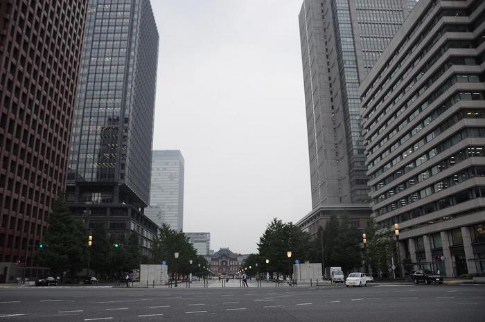 下の写真は、和田倉門交差点の皇居側の交通止め場所から、東京駅中央口を臨み、振り返って皇居側を撮影。