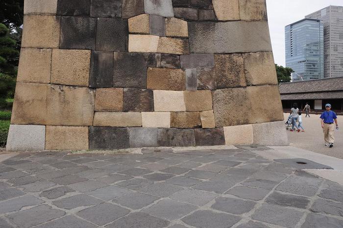 白い花崗岩は瀬戸内の小豆島や紀伊半島あたりから運び、黒い安山岩は箱根・真鶴・東伊豆から運ばれました。ところで、諸大名は、大手三之門の下乗橋前で、馬や家来を残して来たけれど、さらに、百人番所で改めを行なうと、また家来を残して、数人の家臣のみを連れて「中之門」を通過します。