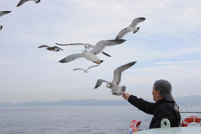 2016年は二度目の乗船である。 今回は、モデルさんにと女性2名に接触、すでにかっぱえびせんを手にしていた男性から分けてもらい、初の餌付け体験を楽しんでいました。 動画で一部始終を撮影しています。 ⇒ 2016年