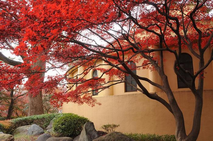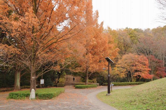 多摩丘陵の自然を活かしての公園ですので、丘の上に造られた記念館から丘の上広場と、もみじ平の広場にはもみじの樹や桜の木が多く植樹されていますが、それ以外は丘陵と谷間にはクヌギ、コナラなど雑木林の紅葉(きいろ)が今を盛りに彩りを華やかにしています。 |