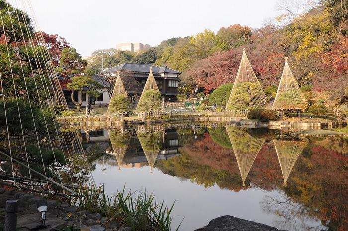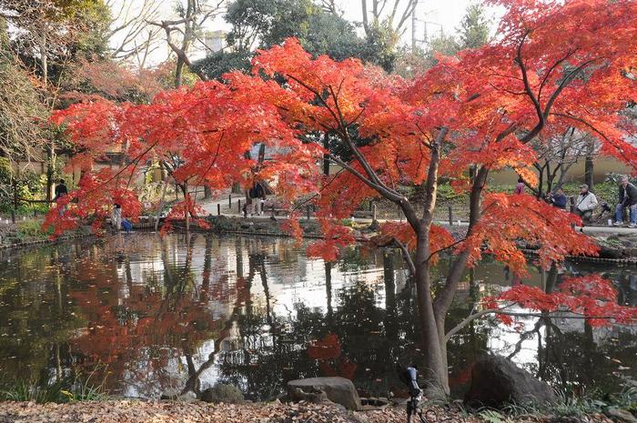 池はこの庭園の中心に位置し、広がりのある景観をつくりだし、池をはさんで背後の台地を山に見立てており、その斜面地は深い木立となっていて、池に覆いかぶさるようにヤマモミジやハゼノキの一群が、秋には真っ赤に紅葉した姿を水面に映し出します。