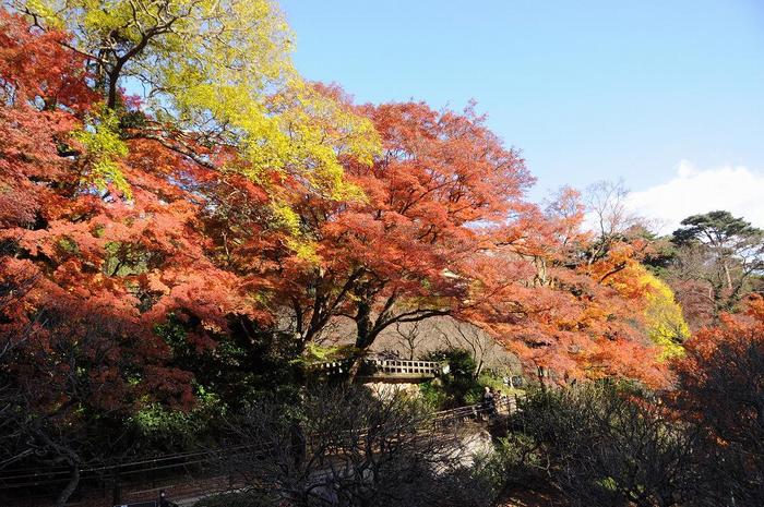 園内にはカエデ類が380本あり、温暖な気候のせいか、毎年11月下旬から12月にかけて色づくため