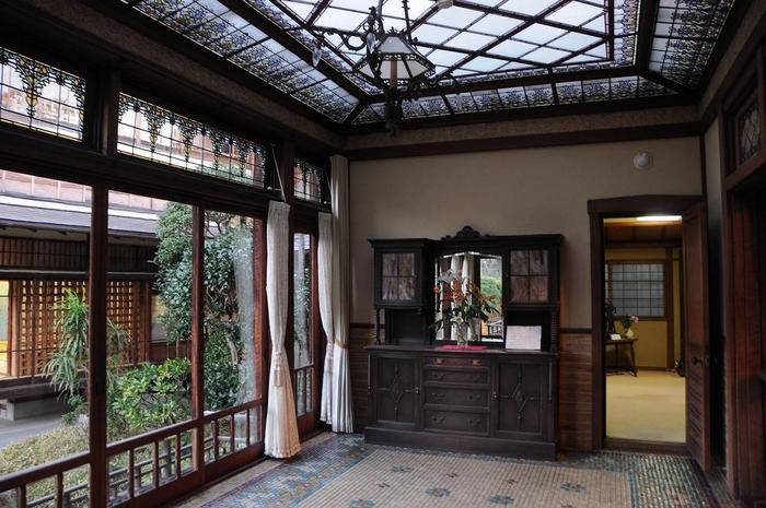 なかでも、「金色夜叉」で有名な尾崎紅葉の間には、「暗しとは柳にうきなあさみどり」と紅葉の句がガラス戸に刻み込まれています。