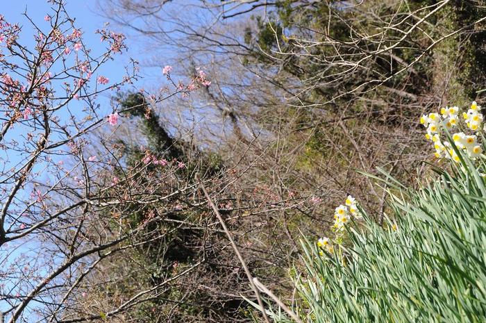 町道の北側・南側には小高い山並みが続くため、盆地のように暖かいためなのか、菜の花、紅梅、白梅、蝋梅、十月桜そして、一本だけでしたが、早咲きの河津桜が見頃になって咲いていました。 |