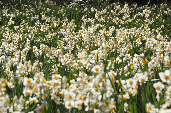 農家が植えるスイセンが、道路の両脇約3キロメートルにわたり、山野斜面を埋め尽くしながら点在し、ハイキングを楽しみながら鑑賞できる。