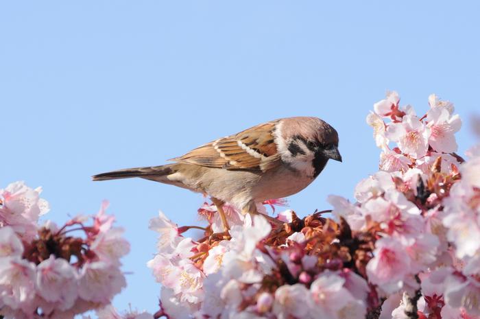 ほとんどの熱海桜は見頃を迎えていました。本数の多い「糸川遊歩道」には、沢山の『メジロ』の他に『ヒヨドリ』が集まり、桜の花蜜を吸っていましたが、なぜなのか、沢山の『すずめ』が飛来して、桜の花びらを散らしています。