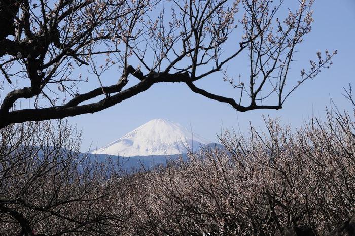 食用梅の生産が目的のための梅林なので、観賞用の古木は有りませんが、知名度が高いので、富士山とのコラボを期待し観光客も多いです。