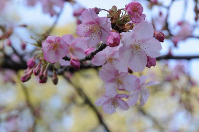 まだ30年未満の若木であるが、2月の花が少ない時期、早咲きの桜のカワヅザクラのピンク色の花に、通りかかった人々が写真に収める光景は、春の気配が漂っている。