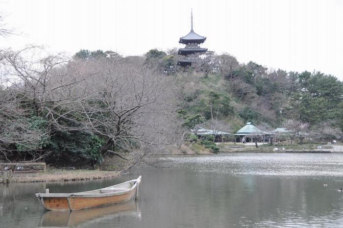 横浜・本牧地区の「三渓園」のトレードマークは「三重塔」、梅の季節には梅の花と、桜の季節には桜の花と、花しょうぶの季節には花菖蒲と、早朝観蓮会の季節にはハスの花と、そして、特筆すべき物が無い時は、大池に浮かぶ舟をコラボレーションする景色が撮影されます。