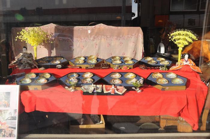 ショーウィンド越しに、「蛤の貝合わせの絵柄」を撮影していたら、表に出てきたご主人が、「お雛様をどのように並べたら良いのかネェー」と。