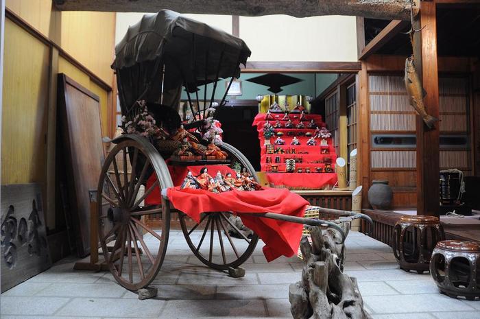 人力車や小舟に、そして座敷にはお雛さまの段飾り、壁には熊の毛皮が画鋲貼り、お雛様は市役所から持ちこんで飾り付けをしたそうだが、「みそ醤油」の看板は書かれている文字が気に入ったから買った。