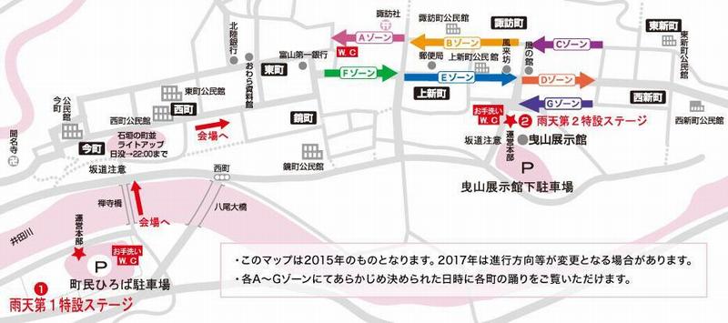 下の写真の各ゾーンとは、おわら風の盆の時の演舞会場ですが、並行しているバス通りで有るD・E・Fゾーンをつなぐ脇道が7本有り、こちらも石畳です。