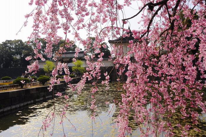 東京駅にも近く、「皇居東御苑」の入出門の一つとして、人通りの多い場所でも有り信号機で足止めをされる場所に、シダレザクラが植樹されている。大手門に向かってのお堀端には、左手に白いシダレザクラが2本、右手には赤いシダレザクラが3本あるが、建物とシダレザクラをコラボすると、「大手門の一本桜」に見えてくる。