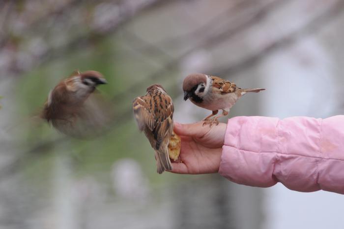 しばらく観察していたが、チーズケーキやカステラでは指先で固形物を摘んでいるので、すずめは3〜4羽しか集まってこないが、お米の場合は手のひらを広げるので10羽ほど集まってくる。