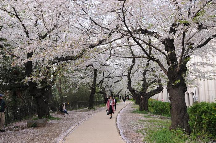 外濠公園には、ソメイヨシノやヤマザクラなど約240本の桜があり、公園が車道から一段上がった遊歩道になっているので、ゆっくりと歩きながら桜のお花見を楽しむことができます。