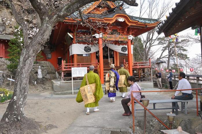 お堂からさらに展望台まで登ると、眼下に桜が広がり、浅間連峰まで広がる絶景を見ることができる。「義仲桜」伝説は、木曽義仲にちなむところから名付けられています。