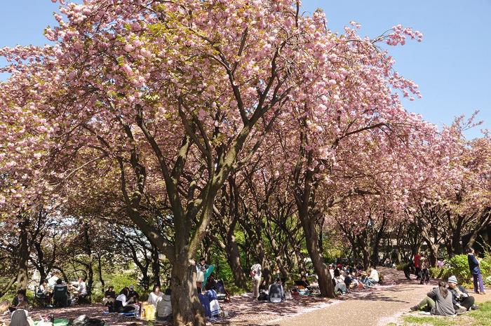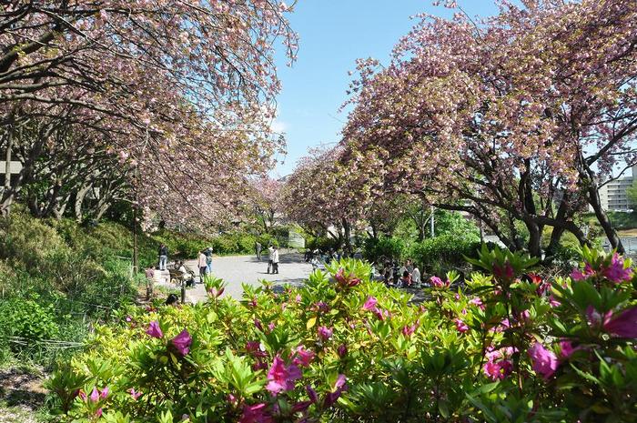 地元では「カーボン山」と呼ばれている「菊名桜山公園」で、最寄りの菊名駅から徒歩10分ほど、公園は小高い丘の上に有った。八重桜は「関山(カンザン)」で、樹高10メートル以上、幹回り2メートル強、樹齢90〜100年で、180本植樹されている。