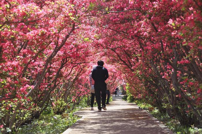 直線で40メートルのトンネルを通り抜けるには、枝にぶつからない様に上を見ながら歩くので、至近距離から色鮮やかな花を眺めるため、より一層、つつじの絶景を間近に感じます。 |