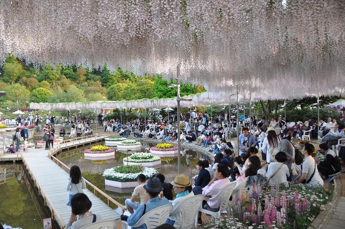 園内の藤の花で一番最初に見ごろを迎えるさくら色のまばゆい藤で、長い棚の下にはベンチ仕立ての階段と腰掛椅子が配置されており、日陰でフラワーステージを眺めながら休息できる。