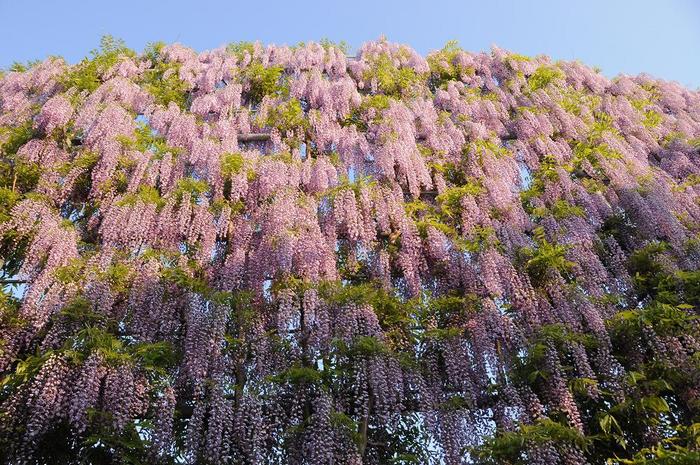 | 「白藤の滝」と「むらさき藤のスクリーン」に共通するのは、建築資材のポールを使用して、高さ10メートルほど、長さ25メートルほどの屏風を作り、正面には土手と池を配置しており、水面に逆さに映る光景も一服の絵になります。 当然、藤の古木は枯れたような幹から曲がりくねって伸びた枝をポール屏風を上部へと這い上がって行きます。