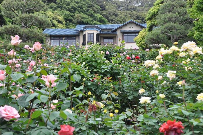 館内は、夏目漱石や芥川龍之介など、鎌倉ゆかりの文学者たちの偉業を伝える資料館であるが、春と秋にはバラの花を目的に訪れる人が多い。