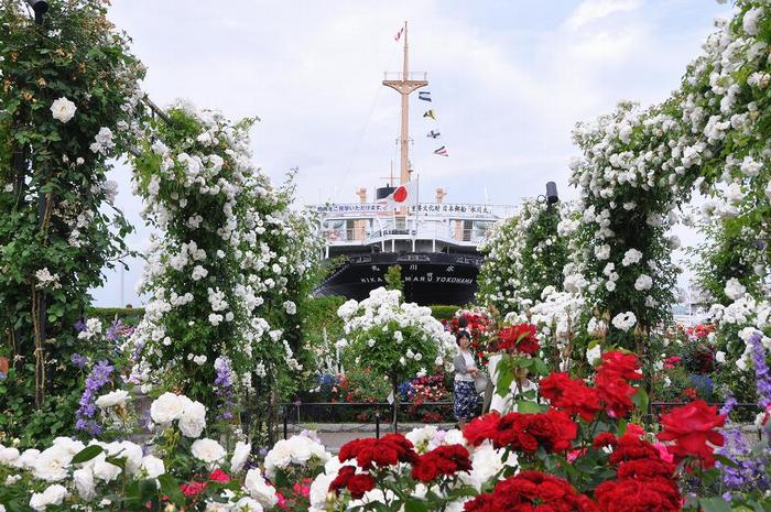 また、山下公園のシンボルである『氷川丸』と「横浜マリンタワー」もバラ園内のどこからも視野に入り、バラの花とのコラボもできる。