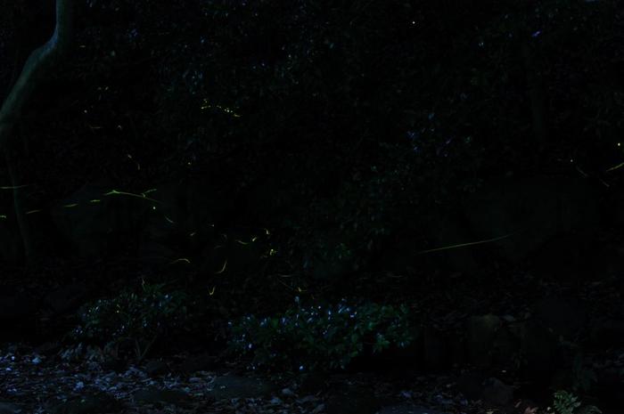 その上、月齢12日のため、月の光が背後斜めから差し込み、カメラ前方の下半分は明るいため、ホタルが小川の上を飛んでくれず、10メートルほど上の木の中を飛翔しているので、全く、絵にならなかった。