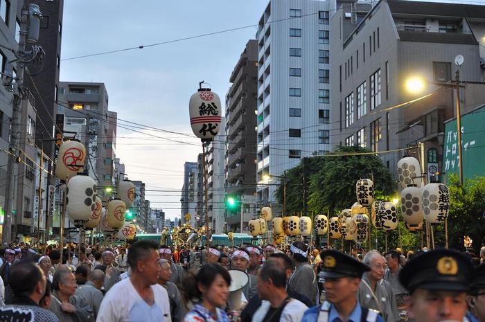 初めて取材に臨んだ今回は、地下鉄・都営大江戸線の新御徒町駅で下車して、お囃子や神輿担ぎの声を探し求めて、闇雲に歩いたが、神社で「渡御順路地図」を購入し、17時10分過ぎに追いついた。