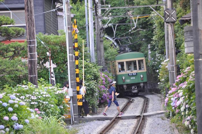 江ノ電の極楽寺駅と長谷駅の中間に、「御霊神社」が有り、鳥居前の踏切付近にあじさいが咲くのである。