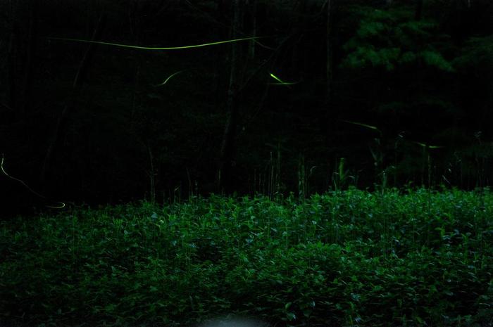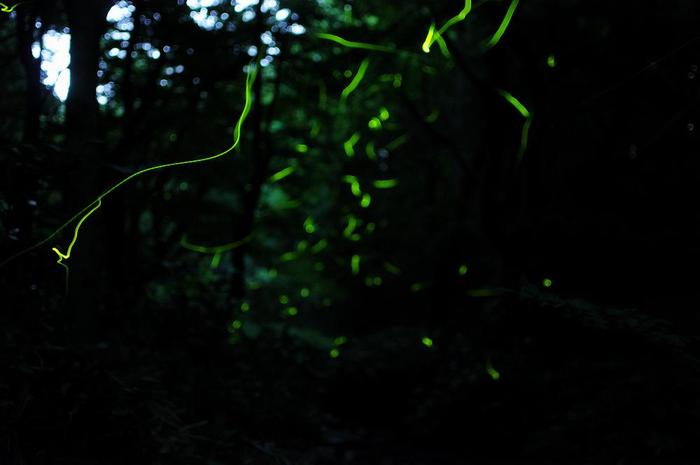 今回は前方7メートルの位置にピントを合わせて見たら、15〜20メートル先のホタルの光は「大きな丸ボケ」、5メートルより手前に飛んできたホタルの光は「火の玉現象」
