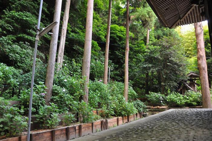 神社の左側を奥に進むと杉木立の下や、本殿の裏手に、あじさいが植樹されていた。