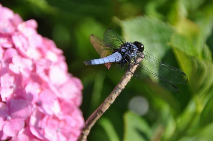 玉ボケは常道ですが、下の2枚の写真のように、緑の葉っぱに、花の影絵が映り込んだり、トンボの羽にピンクの花の色が反射したり・・・面白かった。 |