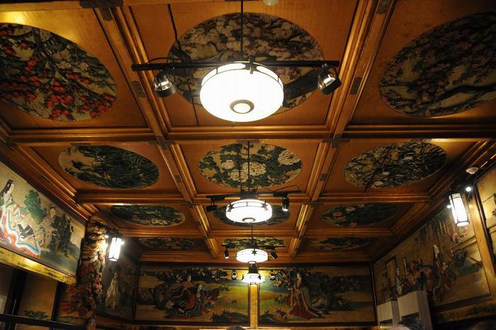 格天井には「菊池華秋」原図による四季草花、欄間は尾竹竹坡原図の藤原時代上流風俗を