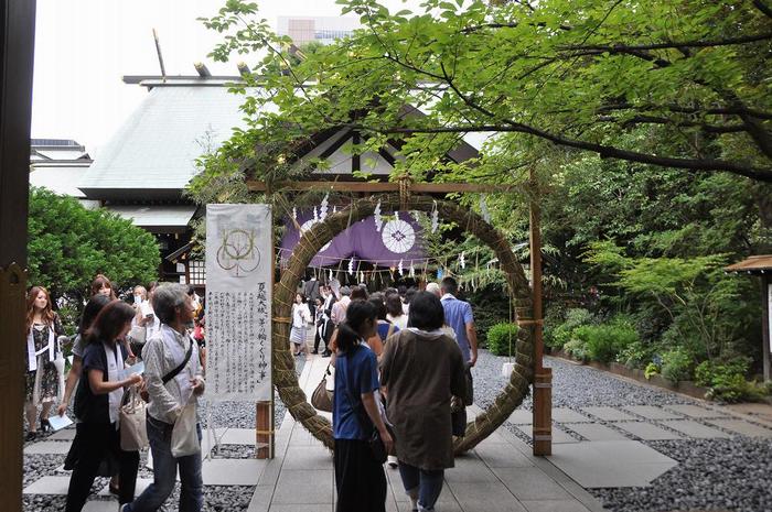 7月に入れば、七夕まつり・・・「恋のパワースポット」の大ブレークです。ところで、「茅の輪くぐり」の神事は16時から・・・到着した時はすでに始まっており、境内には2番目と3番目の順番待ちの人達が待ちわびていました。 |