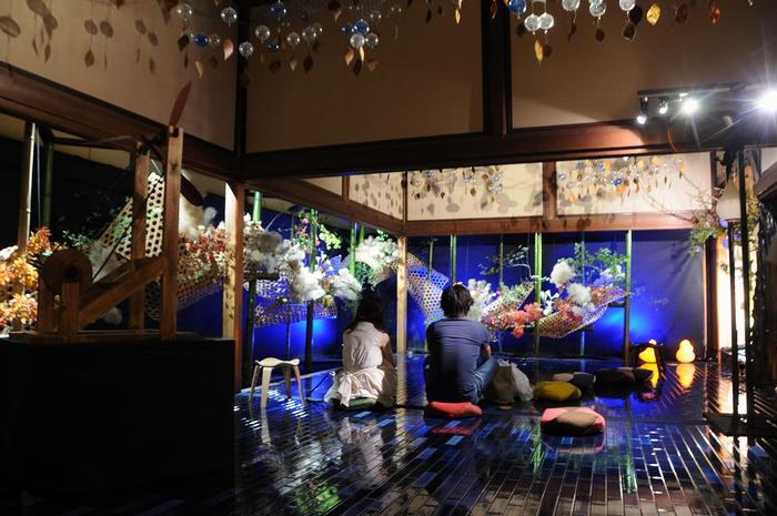 足元には、まるで水面のような青いタイルが敷かれており、頭上からは涼しげな音色を奏でる風鈴が無数に浮かぶので、風鈴を眺めながら、おじゃみ座布団に座って、リラックスされることをお勧めします。