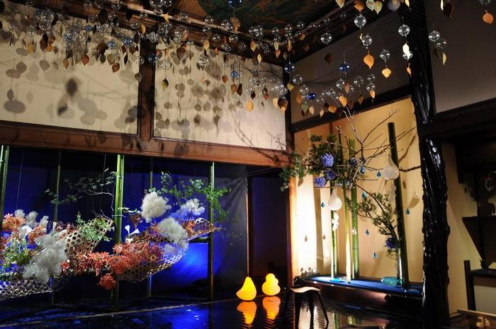 突き当りの部屋には、ねぶたらんぷが飾られており、頂上の間に入ると、「一葉式いけ花」 次期家元 粕谷尚弘監修の『いけ花とガラス作品』の展示です。