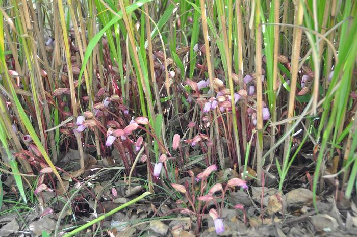 ナンバンギセルは、寄生植物で、薄(ススキ)や茗荷(ミョウガ)などの根に寄生して養分をもらっている。 |