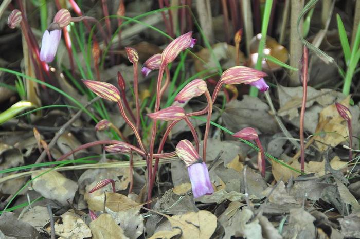 地中から花柄を立て、その先にパイプに似た筒形で薄紫色の花を横向きにつける。