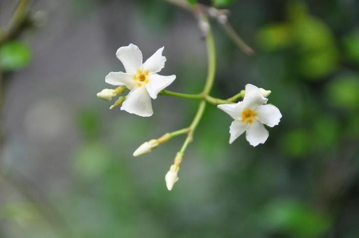 晩春〜夏にかけて、ツルの先の葉腋や枝先に房状(集散花序)に多くの花をつける。