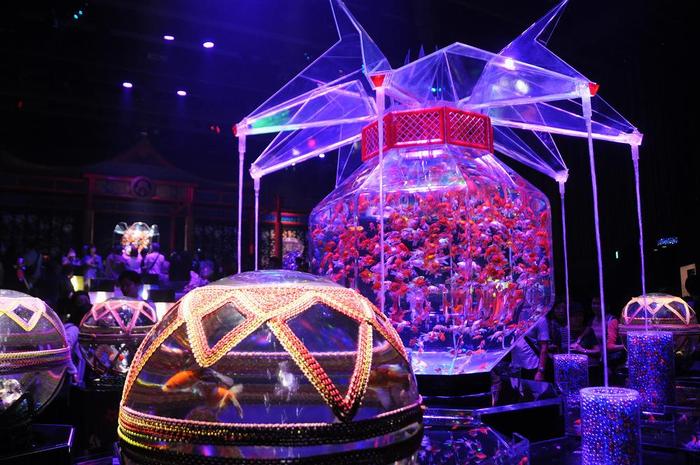 第三章は、「超・花魁(おいらん)」と命名される場所、金魚を3000匹収容する最大直径5.6メートル、高さ3.5メートルの大水槽である。