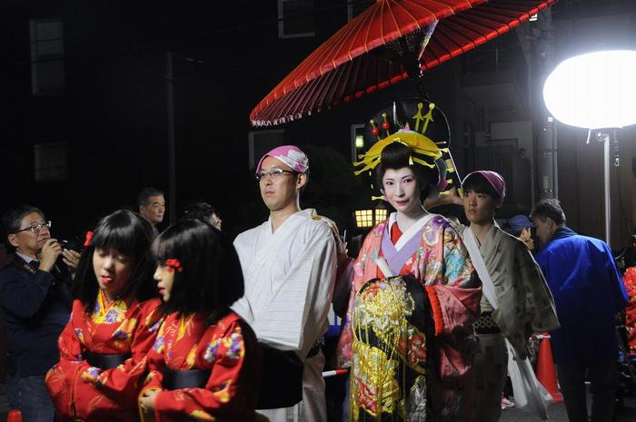 3年後の2020年には、多くの外国人が東京に集まるのを先取りし、今年の5名のおいらんの中に、インドネシアから参加した女性と、肩貸しの男性がいた外国人のおいらんも特訓の成果で、りっぱな外八文字の歩き方披露。16時30分から19時までのイベントのため、後半は、照明不足でピンボケ写真が多くなった。 |