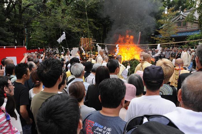 そして、この儀式のあと、炎が上がっている護摩火の上を、熱湯を浴びた導師が先ず火渡りをして、続いて山伏(行者)達が護摩札を抱えて次々と渡る。
