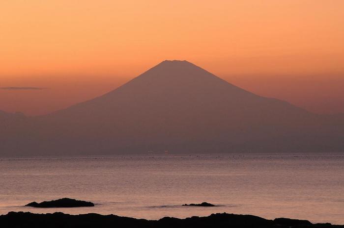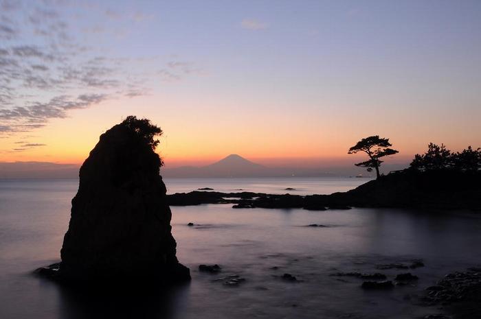 立石海岸の目玉は、巨岩の「立石」と「ぼんてん」と呼ばれる自生する松の木の岩場の間に「富士山」が見える。