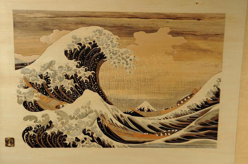 白波が崩れて飛沫となった白い粒々も、ベース板にドリルで穴を開け、白い木材で小さな丸粒をつくり、はめ込むという繊細な技術。 |