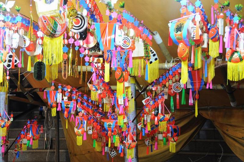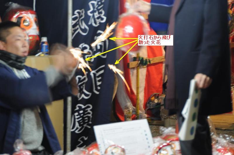大小さまざまな大きさの張り子だるまがところせましと出店に並び、縁起物のだるまを買い求めるお客さんが来ると「魂入れ」が行われ、火打石の音ととともに火花が飛ぶ。