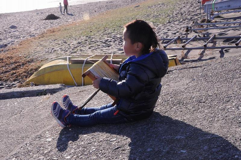 近づくと、驚くことに5〜6歳の子供が大人の使用する本格的な糸巻きをたどたどしく、糸を手繰り寄せたり緩めたりしている。